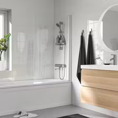 Благодаря аксессуарам серии ТИСКЕН все необходимое в ванной будет под рукой, и при этом вам не придется сверлить отверстия в стене. С помощь присосок вешалки, крючки и держатели будут надежно закреплены на гладкой поверхности, например стекле