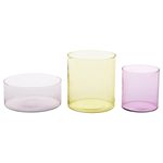 Штабелируются, экономя место при хранении. В набор входит: 1 ваза (высота 20 см, диам. 18 см), 1 ваза (высота 15 см, диам. 14 см) и 1 миска (высота 9 см, диам. 22 см). Стекло.