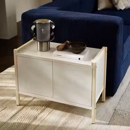 Универсальный шкаф EKENABBEN с минималистичным дизайном дополнен дверцами с нажимным механизмом, за которыми можно спрятать все вещи.