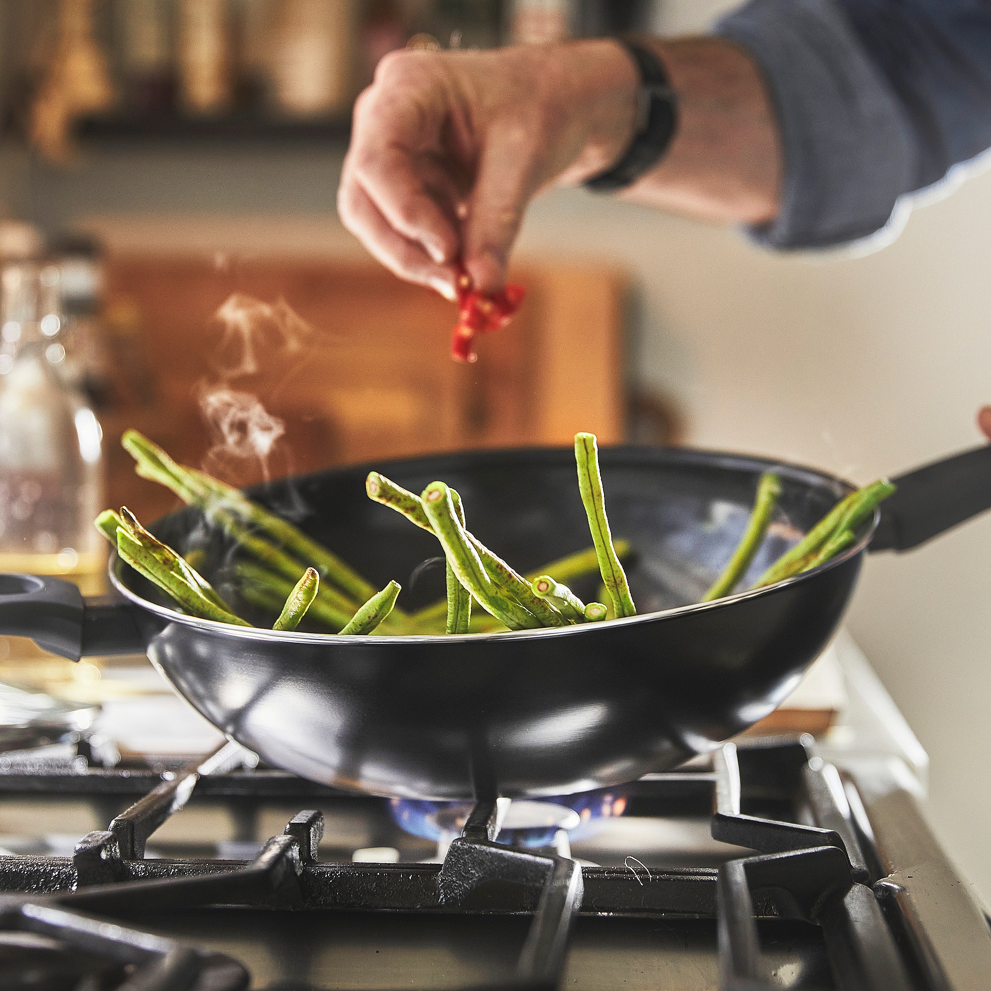 Благодаря наклонным стенкам пища попадает на дно, которое нагревается сильнее; для получения хрустящей корочки необходимо тщательно перемешивать.