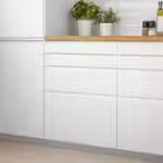 Гладкие матовые фронтальные панели ящиков ВОКСТОРП с интегрированными ручками придадут открытый современный облик интерьеру кухни.