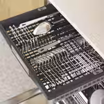 Гибкий выдвижной лоток для столовых приборов образует третий уровень для укладки посуды и не даёт приборам падать друг на друга.