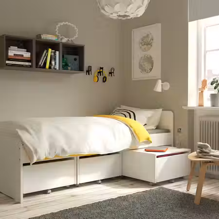 Кровать с лаконичным дизайном и 3 просторными ящиками на колесиках, которые можно выдвигать и использовать как столики.