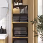 Вместительный шкаф для узких пространств защитит полотенца, фен для волос и другие принадлежности от пыли и посторонних глаз.
