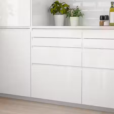 Фасады ВОКСТОРП с белой глянцевой поверхностью создают чистый, современный вид и дарят ощущение света и простора.