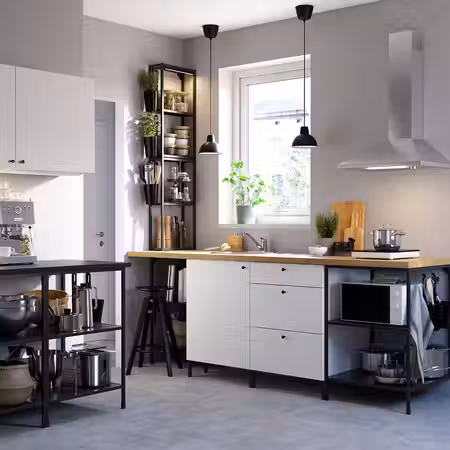 Дополните ее матовыми фасадами УППЛЁВ серо-бежевого цвета со встроенными ручками и скошенными краями, и получится строго очерченный дизайн в современном стиле.