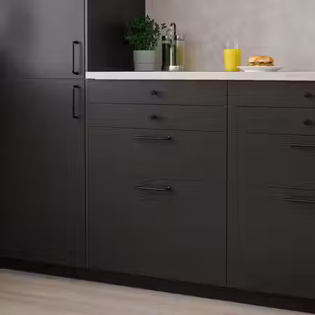 Дополните фасадами ЛЕРХЮТТАН с покрытием черной морилкой, чтобы придать интерьеру теплую традиционную выразительность.