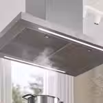 Эта потолочная вытяжка из нержавеющей стали с регулируемой светодиодной подсветкой — словно вишенка на торте вашего кухонного островка.