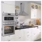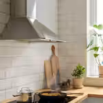 Эта вытяжка из нержавеющей стали с мягкими скруглёнными краями и переключателями в стиле ретро придаёт кухне традиционный вид.