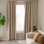 Затемняющая гардина РОСЕНМЭНДЕЛ из бежево-желтой ткани, похожей на шерсть, с меланжевой расцветкой создает спокойную обстановку в гостиной или спальне и не выглядит слишком тяжелой.