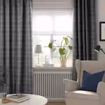 Затемняющие комнату гардины ХЭГГВЕККМАЛ из ткани, которая выглядит как шерстяная, с классическим узором в темно-серую клетку и подходящей подкладкой создают ощущение уединения.