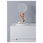 Основание и крючки зеркала можно использовать для хранения украшений и аксессуаров. Защитная пленка снизит повреждения, если зеркало разобьется. Пластиковые ножки под основанием защищают поверхность от повреждений. Диаметр: 25 см. Высота: 48 см.