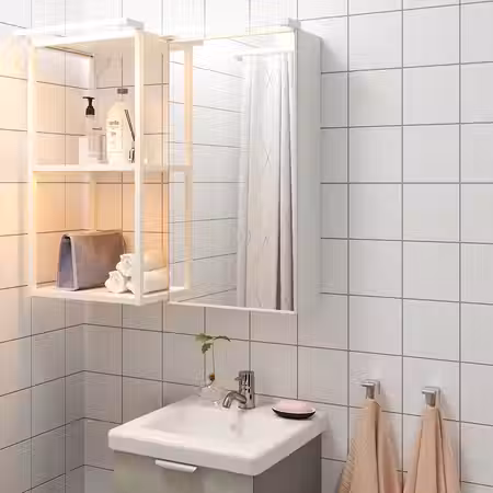 Мебель для ванной ЭНГШЁН выглядит современно и лаконично с минимумом деталей.