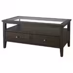 Этот журнальный столик со стеклянной столешницей и деревянным каркасом подчеркнет элегантность интерьера.