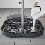 Каждую часть опоры зонта от солнца необходимо полностью заполнить песком. Для этого нужно примерно 64 литра песка, что обеспечит общий вес около 90 кг.